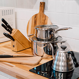 包丁、まな板、トング、お玉、栓抜き、鍋、フライパン、ボウル、やかん