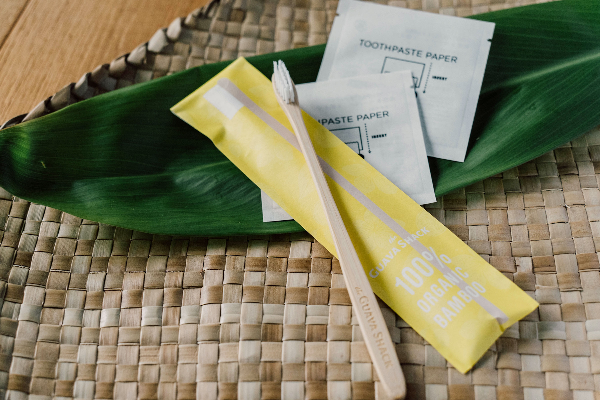 グァバシャックオリジナルのオーガニック竹歯ブラシと、歯磨き粉がペーパー状になった歯磨きペーパーをご用意しております。