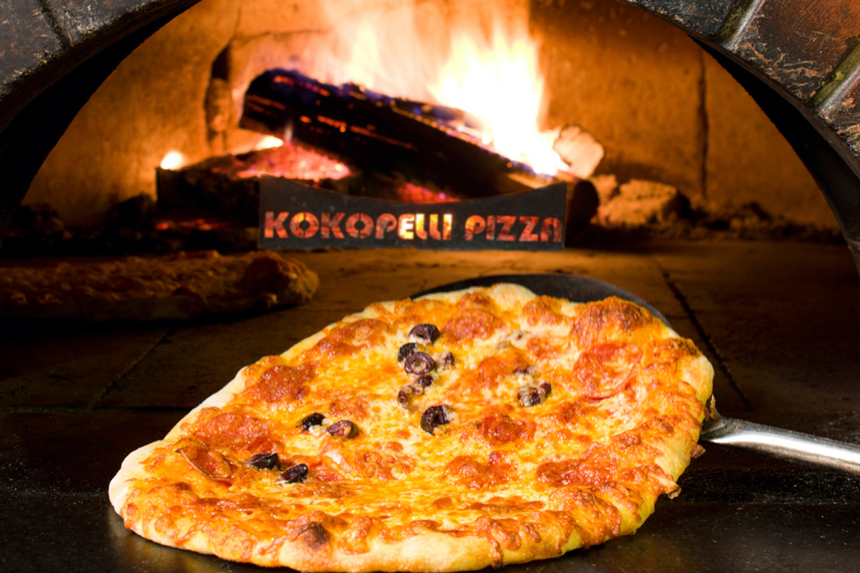 読谷村にあるココペリピザ。オーナーのマイクさん手作りの石窯で焼くピザは絶品!ココペリファミリーは、まだグァバシャックがぽつんと受付棟しか建っていない頃から、現場を見に来て応援してくれていました。